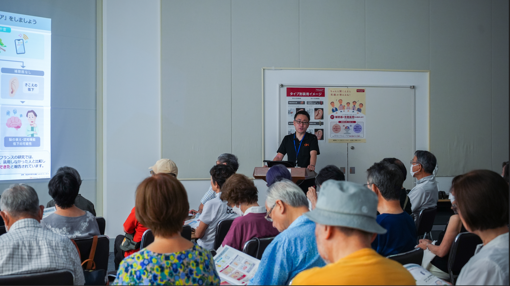 講師にリサウンド補聴器の松永先生を迎え、まずは難聴と認知症の関係や、補聴器と集音器の違いなど、知っておきたい基礎知識についてお話しました。専門的な内容も、できるだけわかりやすくお伝えすることを心がけました。